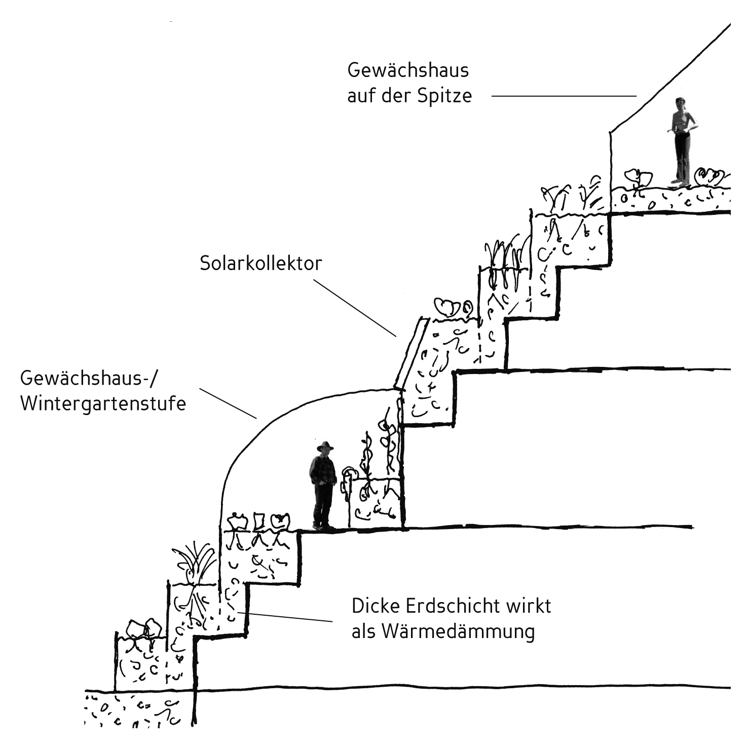 Öko-Pyramiden sind keine glatten Pyramiden, wie sie dem pharaonischen Konzept entsprechen, sondern Stufenpyramiden, obwohl man sie zum Zwecke der Solarenergiegewinnung auch glatt konzipieren kann. Die Stufen sind gut 1 m hoch und werden mit ebenso hohen erdgefüllten Wannen bedeckt, die etwa 0,5 bis 1 m breiter sind, so dass die Pyramiden von einer dicken, terrassierten Erdschicht bedeckt sind. Man kann die Stufen zwar auch schmaler und niedriger machen, aber wer Pflanzkästen mit einem Querschnitt von 30 x 30 cm oder 40 x 40 cm kennt, der weiß, dass sie schnell durchwurzelt sind, leicht austrocknen und im Winter leicht komplett durchfrieren, wobei ein Teil des Bodenlebens zugrunde geht und die notwendigen Zersetzungsvorgänge im Frühjahr nicht richtig in Gang kommen, mit der Folge, dass man die Erde in diesen Kästen jedes Jahr austauschen muss. Bei einer Bodenhöhe von 80 oder 100 cm kann der Boden gar nicht ganz durchfrieren, so dass Würmer und anderes Bodenleben, das sich im Winter in frostfreie Regionen zurückzieht, hier überleben und im Frühjahr sofort seine Arbeit wieder aufnehmen kann. Auf diesen Terrassen kann man Gemüse, Kräuter, Blumen und sogar Beerensträucher und Kleinstobstbäume anbauen, so dass ein Teil der Fläche, den die Wohnpyramide belegt, für die Bewirtschaftung gar nicht wirklich verloren geht.